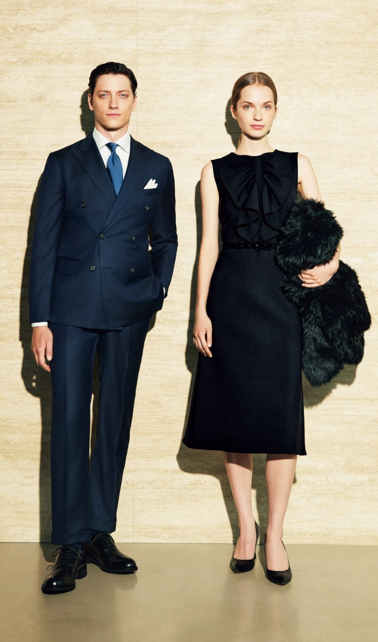 ●日本橋、新宿、玉川、横浜、大阪、京都「婦人服」イタリアの名門・エルメネジルドゼニアに高島屋が別注した生地を使ったオーダースーツ。奥行きのあるカラーと深みのある艶は、生地のトップブランドならでは。無地に見えるがごく細かい菱目模様が出る織り方で、仕立てたスーツはベーシックながら贅沢で存在感のある1着に。