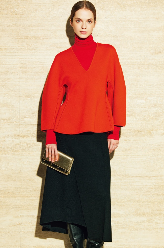ウエストを絞った立体的なペプラムが映える鮮やかな柿色のニットトップスに、細くしなやかなハイゲージのハイネックプルオーバーをレイヤードした、レッド×レッドのコーディネートでホリデー気分を演出。さりげなく構築されたアシンメトリーラインが美しいスカートを合わせてエレガントなドレスアップスタイルに。ミラノの老舗ブランド「FRANZI」のゴールドのミニバッグは、付属のチェーンにより、肩がけ・手持ち・クラッチの多彩なアレンジが可能。