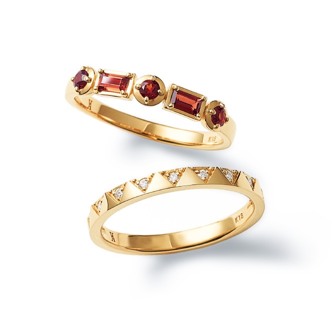 グラフィカルな模様を描くガーネットとダイヤモンドの2本セットリング。華やかなサーカスの、次々に繰り出される演目を思わせる、異なる表情が魅力。2本をレイヤードしたり、お手持ちのリングと組み合わせたりと、オリジナルなアレンジを楽しんで。