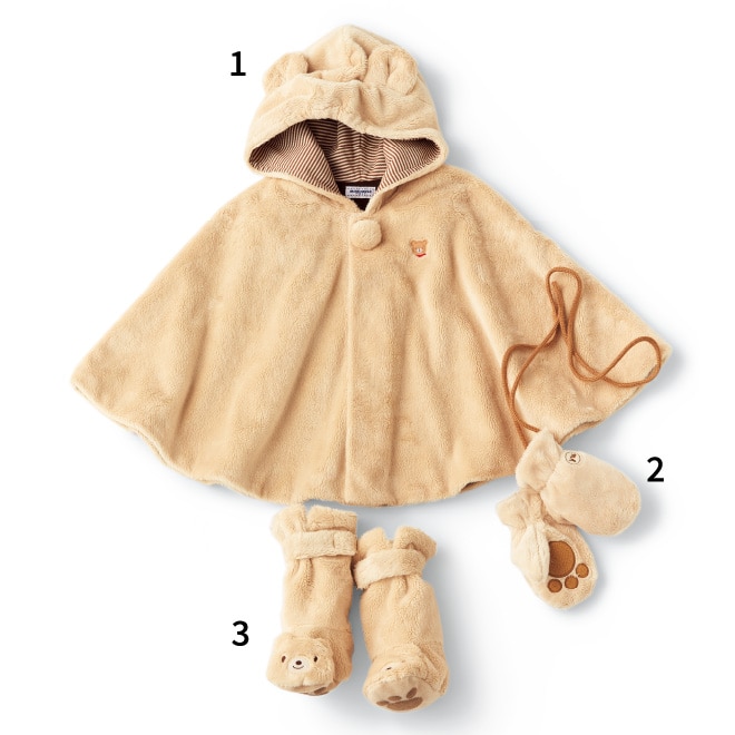 しっとりとなめらかなマイクロファーは、裏地の天竺素材とともに赤ちゃんの肌をやさしく包みこむ。くま耳付きの防寒マントはひざかけからおくるみ、マントまで成長にあわせて活躍。肉球モチーフのブーティーとミトンは、かわいらしさだけでなく滑り止め付きで安心感も◎。冬の街角でも思わず抱きしめたくなるキュートなコーデが完成。