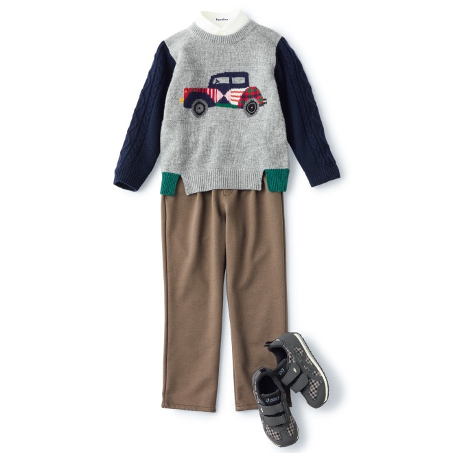 確かな素材と誠実なものづくりのファミリアが創業時代から大切にしてきた、インターシャ編み。裏に糸が渡らない製法で凹凸が少なく、鮮やかな柄が特徴。新作の車柄のセーターは、柔らかい着心地に加え、袖や裾の配色など遊び心もたっぷり。オックスフォードシャツとタックパンツに合わせて端正に、足元にはファミリアチェックをあしらったアシックスとのコラボスニーカーで軽やかさを。