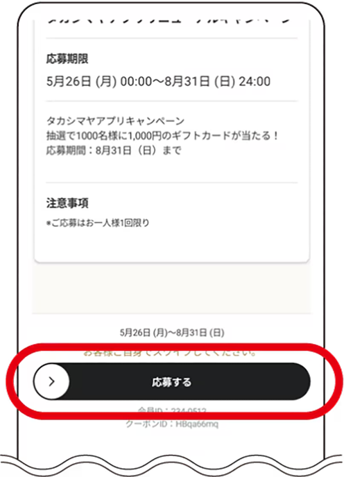 タカシマヤアプリをダウンロードのうえ、会員登録をしていただき、「クーポン・特典」の応募画面よりご応募ください。後日抽選を行い、11月27日(木)頃に抽選結果のメッセージをお送りいたします。抽選結果はタカシマヤアプリの「あなたへのメッセージ」に配信いたします。