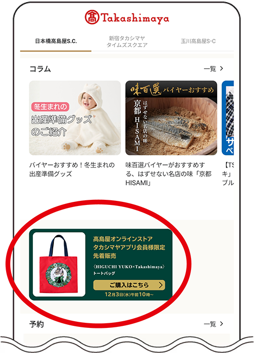 タカシマヤアプリのメッセージまたはホーム画面の「高島屋オンラインストア購入ページはこちら」よりアクセスいただけます。
