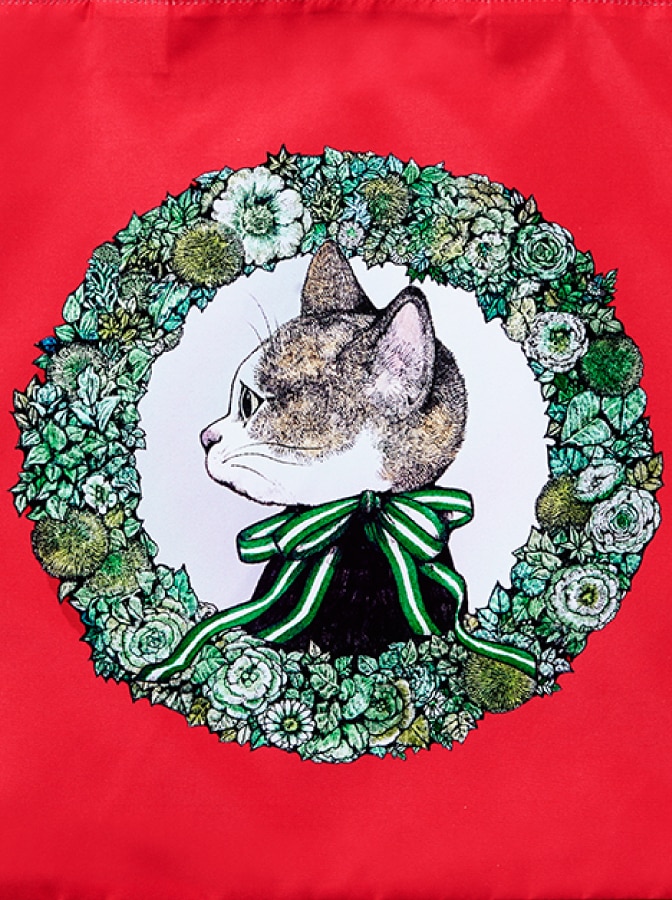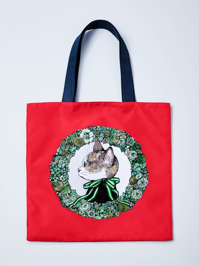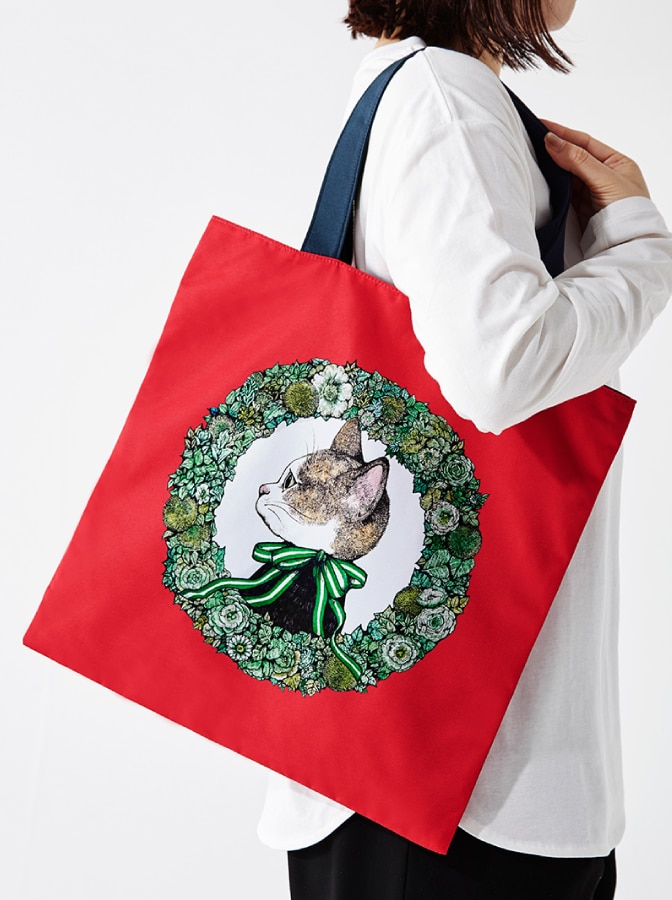 A4サイズもすっぽり収まるサイズで、内ポケットが付いており、持ち手を肩にかけることもできます。ポリエステル生地にプリントすることで、原画の繊細な色使いを再現。深みのある赤がクリスマス気分を上品に演出します。