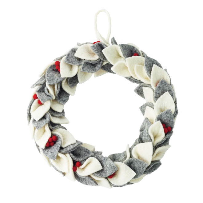 温もりを感じるフェルト素材のクリスマスリース。デンマークのブランド・グライアンドシフの製品は、すべてハンドメイドで、ひとつひとつ異なる表情が愛おしい。2色のフェルトをリーフの形に加工して交互に重ねた立体デザインは、どの角度から見ても豊かな表情を楽しめる。北欧ならではの色使いとやさしい素材感が冬のインテリアを美しく彩る。