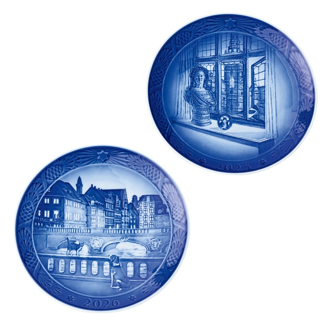 デンマーク王室御用達ロイヤル コペンハーゲンのイヤープレートは、特別なメモリアルアイテムとして毎年人気。創業250周年を迎えた2025年版は、創業に関わったジュリアン・マリー皇太后を讃えたデザイン。2026年版はコペンハーゲンのマーブルブリッジを猫と犬が見つめる情景が、職人の手仕事で丁寧に描かれている。