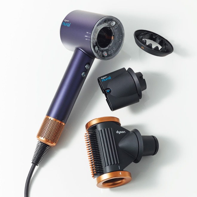 美髪効果と技術力で支持を誇るダイソンのドライヤー。Nural™センサーが髪との距離を計測し、熱ダメージを抑えながらツヤを引き出す。スカルプモードやオート設定アタッチメントによって、スタイリングも手軽で、男女問わずヘアケアの質を高めたい人にぴったり。百貨店・直営店限定カラーのダークブルー/コッパーは、家族やパートナーでもシェアしやすい洗練されたデザイン。日々のヘアケアを楽しい時間に変えてくれる。
