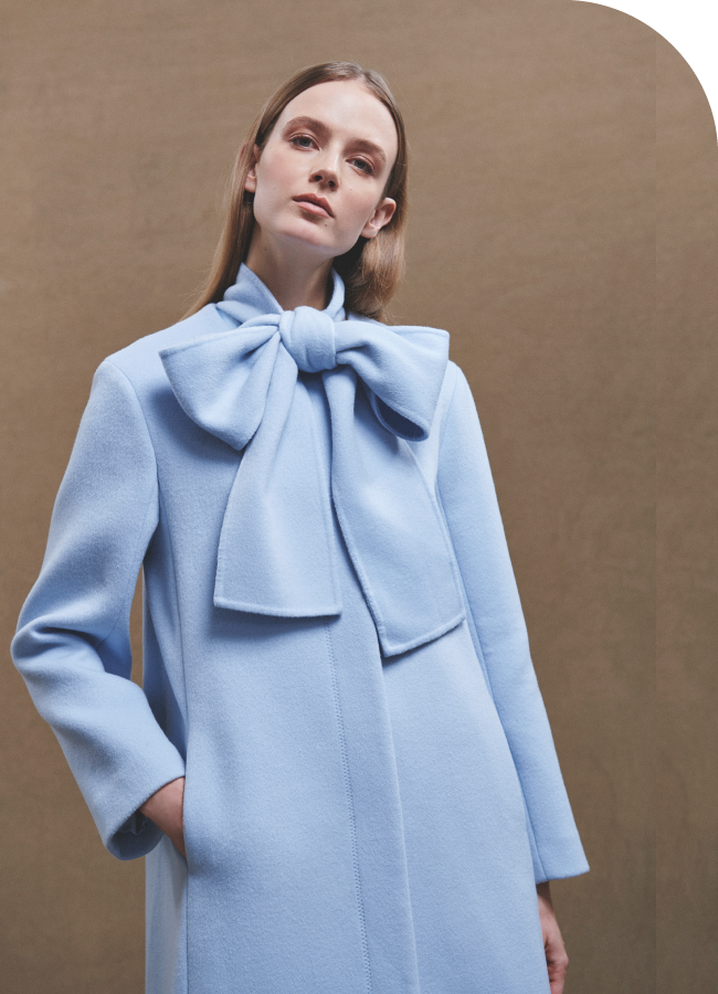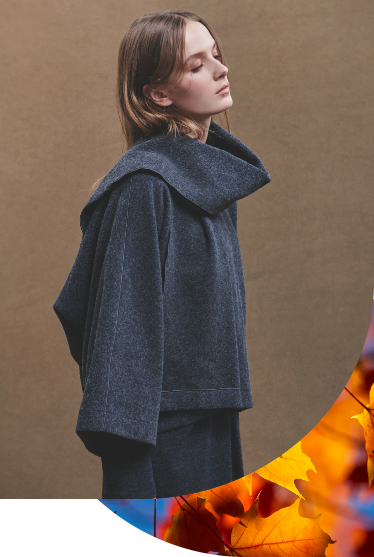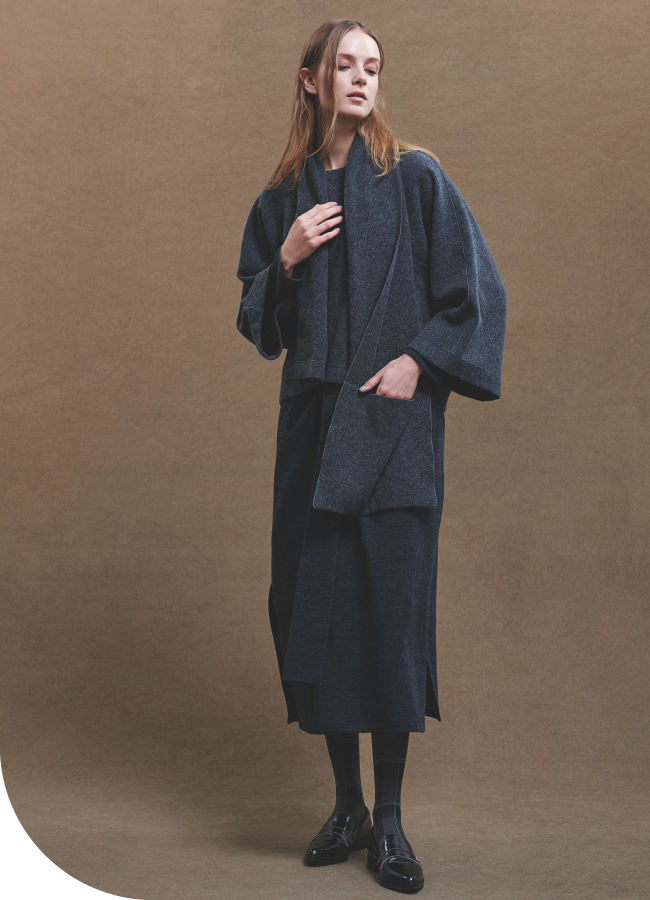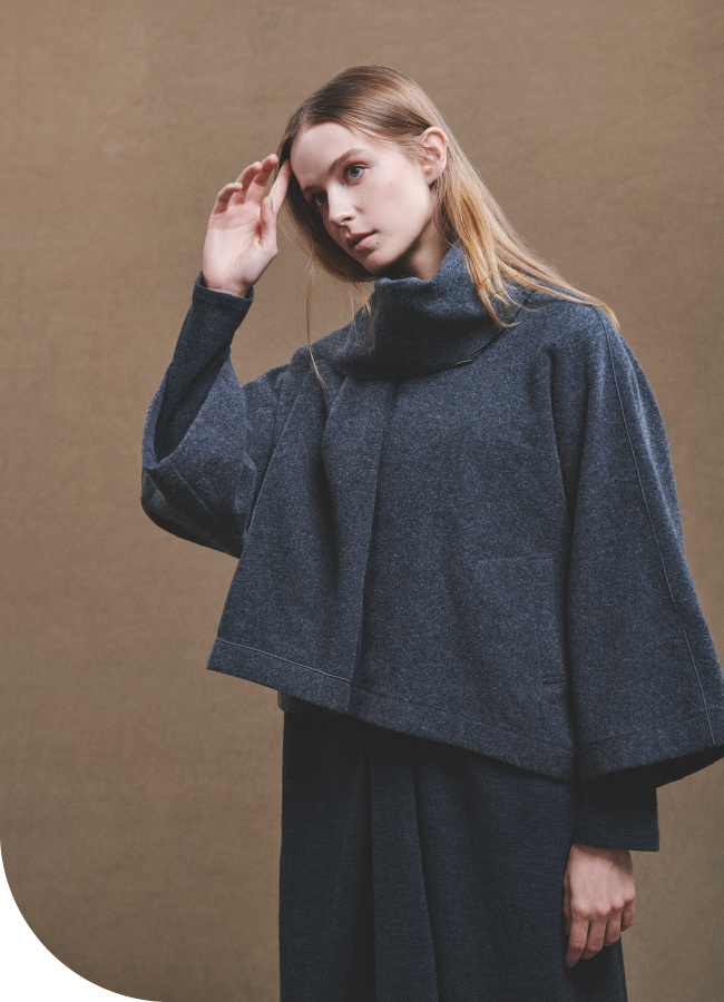 後ろ姿にも遊び心が。ビッグカラーに斜め裾。