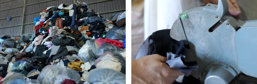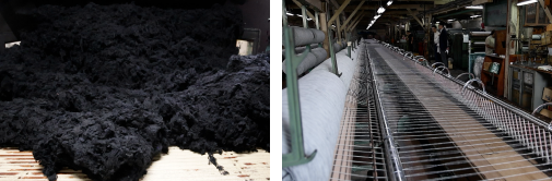 店頭にてお客様から回収した「休眠スーツ」の重量を計測後、ウール混率70%以上を基準に選別。回収されたスーツの半数以上が再生可能な素材に該当する。スーツは表生地以外にも芯地やパッド・裏地など多種多様なパーツで構成されており、部位ごとに異なる素材が使われているため、手作業で丁寧に裁断し、再生できる部分を最大限に確保する。裁断された生地は反毛機に投入し、ワタの状態に戻す。それ以外の素材は、国内外でリユースするほか、自動車内装材や軍手などにリサイクルされる。