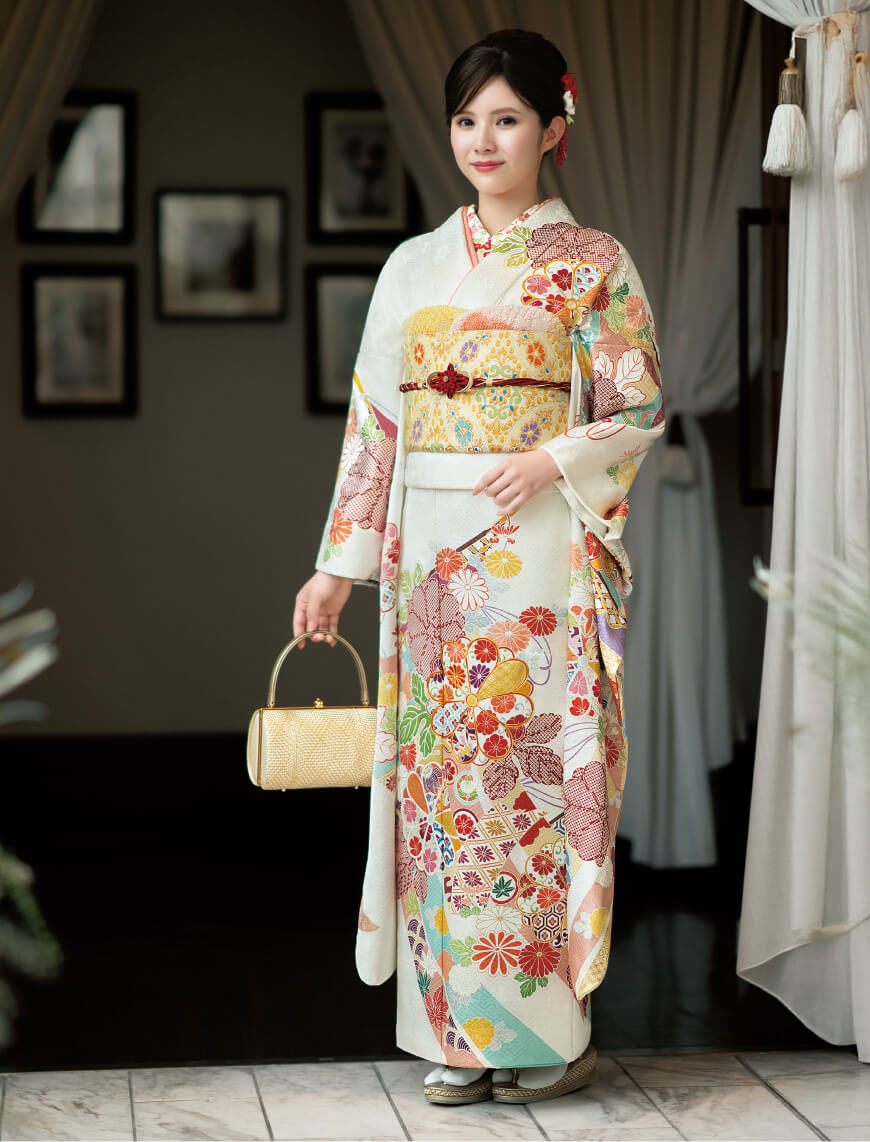 咲き誇る花々を雲取りの間に描いた屛風絵を見るかのようなデザイン。地の多彩な染め分けや絞りがいっそう豪華さを添えます。成人式だけでなく結婚式などにもふさわしいきものです。