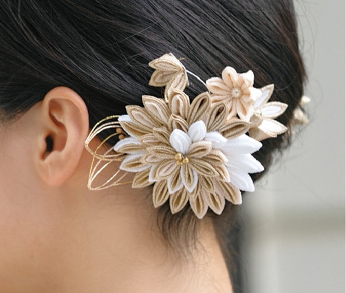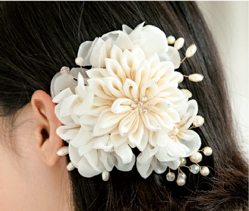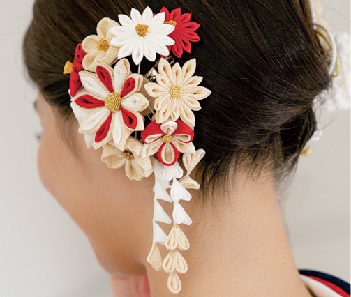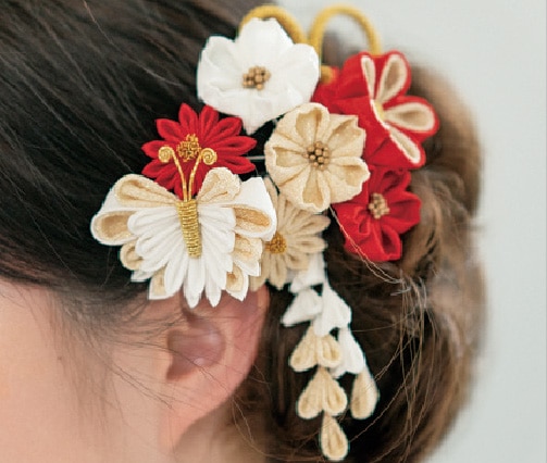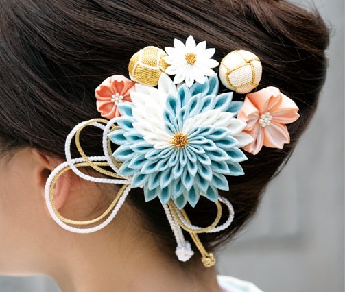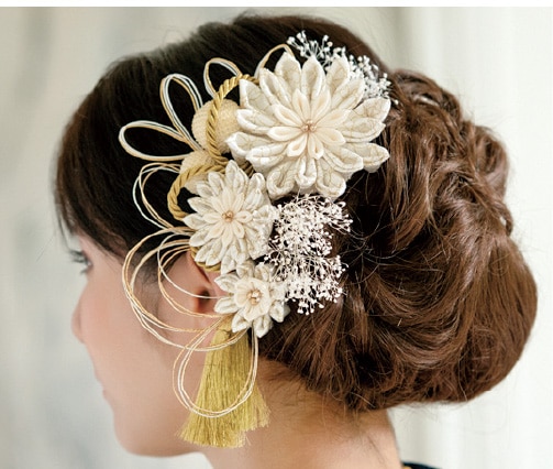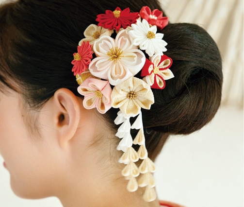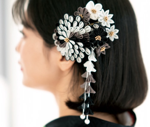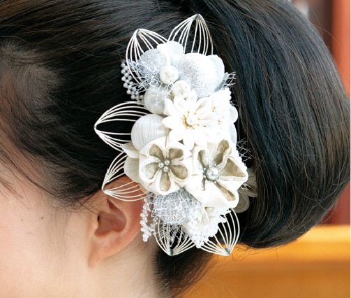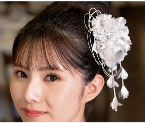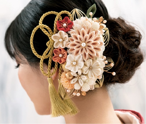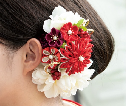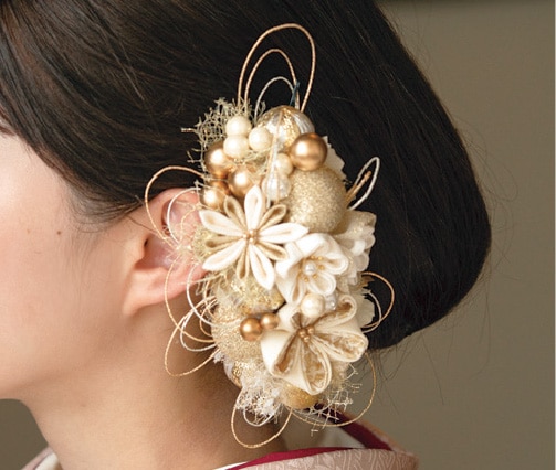 振袖姿を彩るヘアスタイル。その仕上げは、精緻な技が生み出す手作りの髪飾りです。 ここでは、モデル着用の髪飾りの片側だけをクローズアップします。