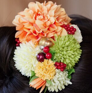 華やかな印象を醸し出す、光沢のある白地に、優しい配色でさまざまな花を描きました。胸や袖にもたっぷりと柄付けされた振袖には、黒地の袋帯を合わせて高雅に。