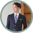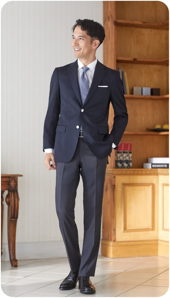 イベントシーンで活躍するスーツもオーダーで。 シンプルなネイビー無地は明るめのカラーを選び、ピークドラペルのデザインにすることで華やかな印象に。