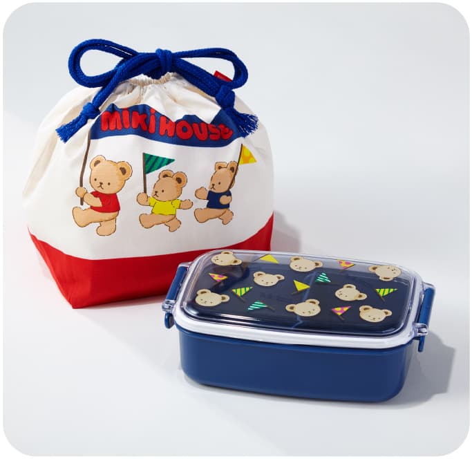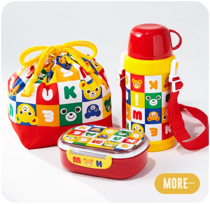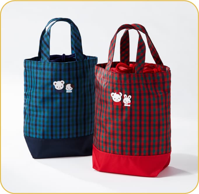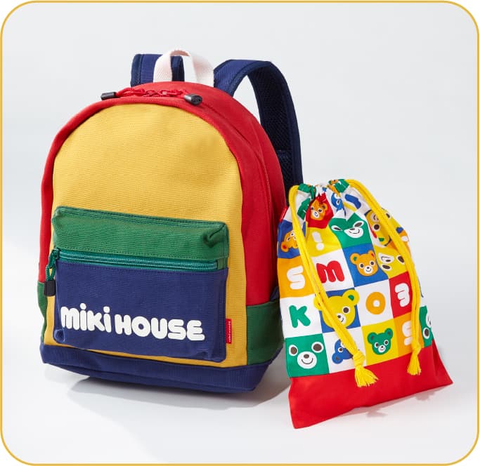 カラフルなリュックや小物で楽しい毎日を。ミキハウスロゴのシンプルな定番リュックとパズルブロックを並べたような愉快なデザインのプッチーシリーズの巾着袋です。