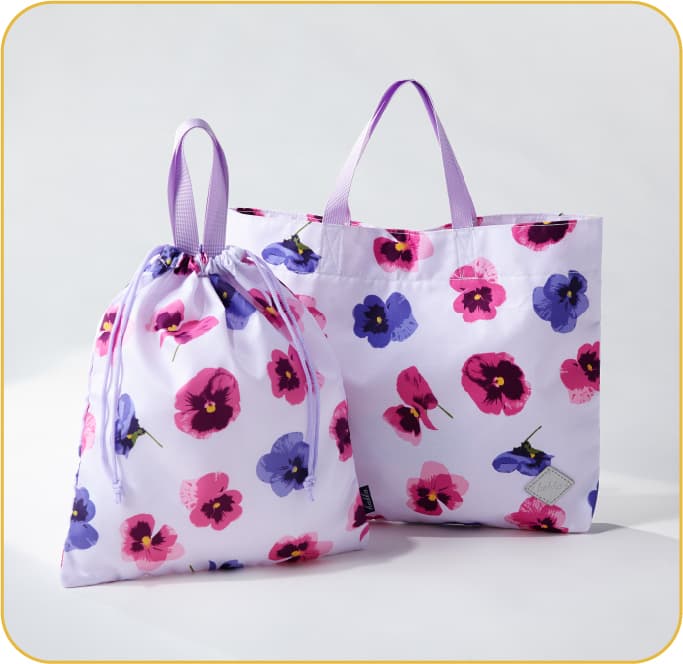 人気のスミレ柄をミックスしたレッスンバッグ。巾着バッグとお揃いになるのがポイント。