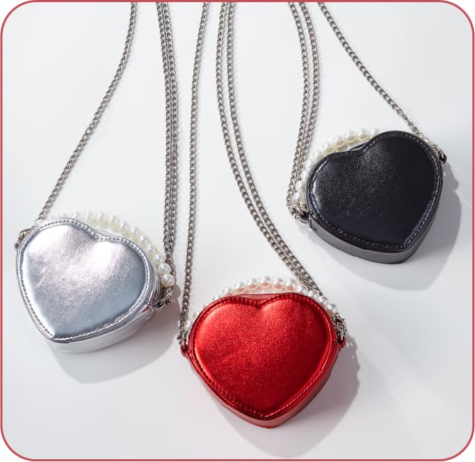 シルバーのチェーンと、パールビーズのストラップがアクセントの可愛いハート型ポシェット。