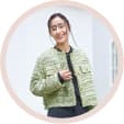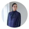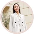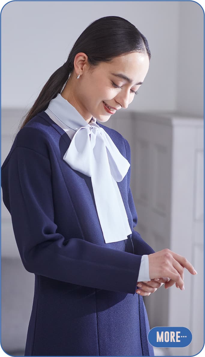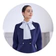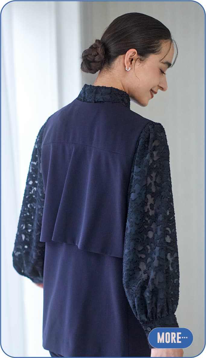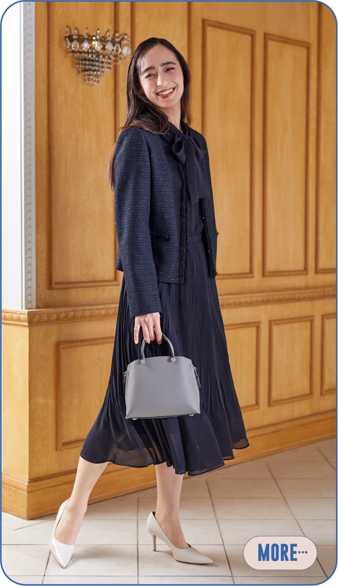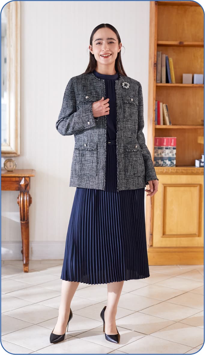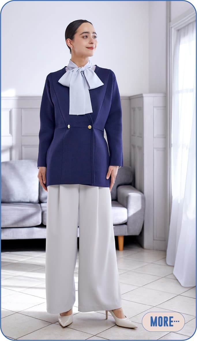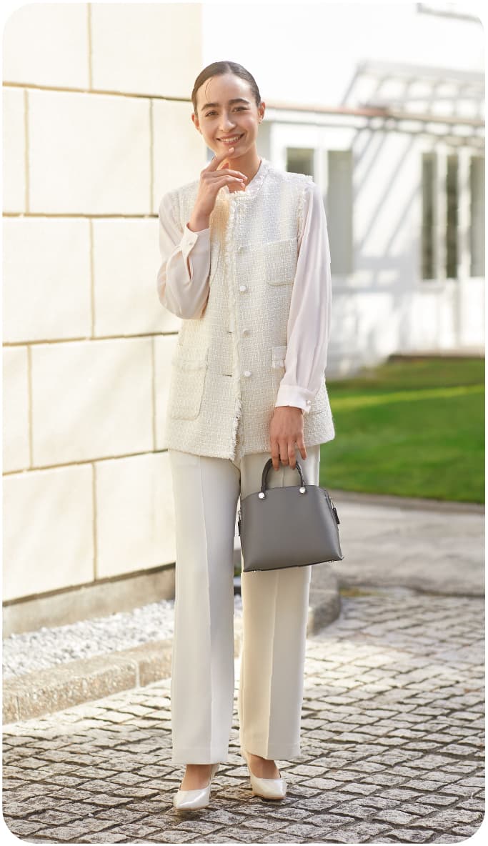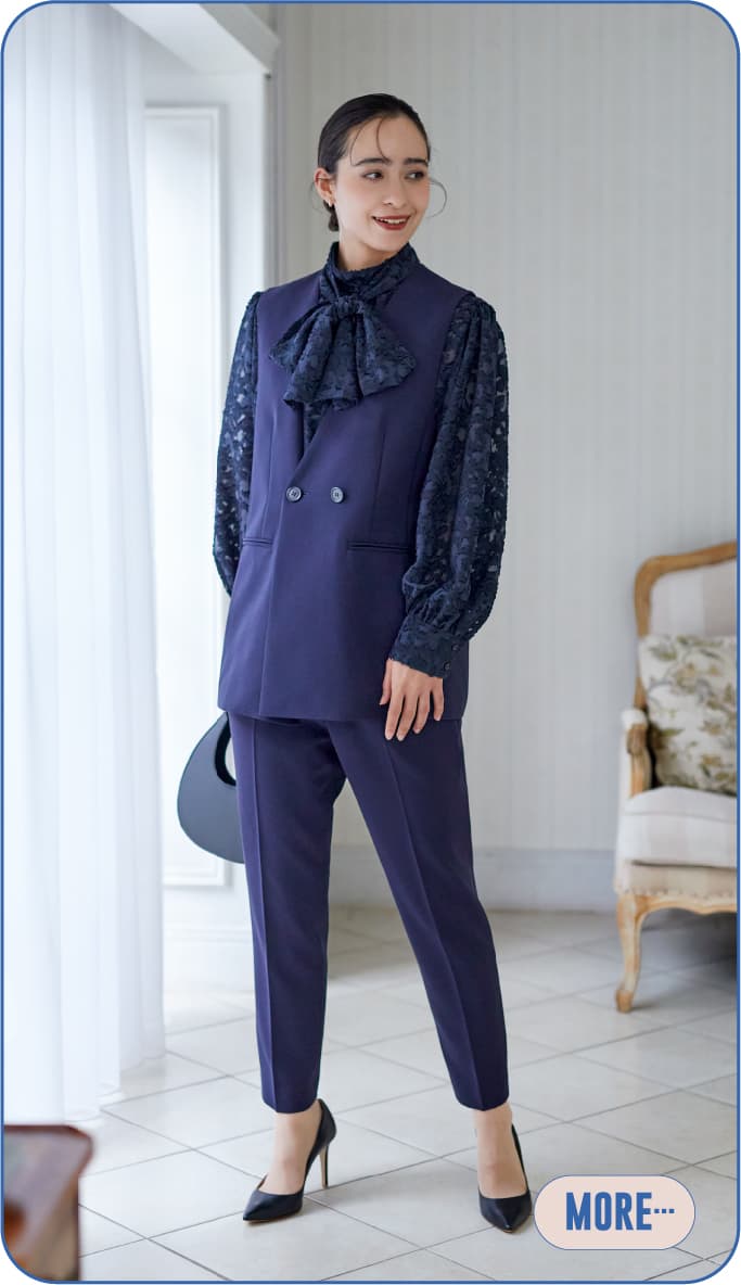 前立てが2枚重なり、ベストをレイヤードしているように見えるジャケット。モード感が漂うジャケットも、ワイドパンツとボウタイブラウスのコーディネートできちんとした装いに。
