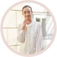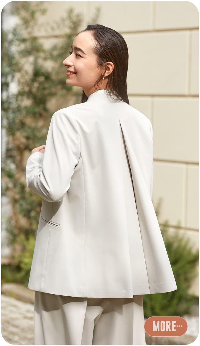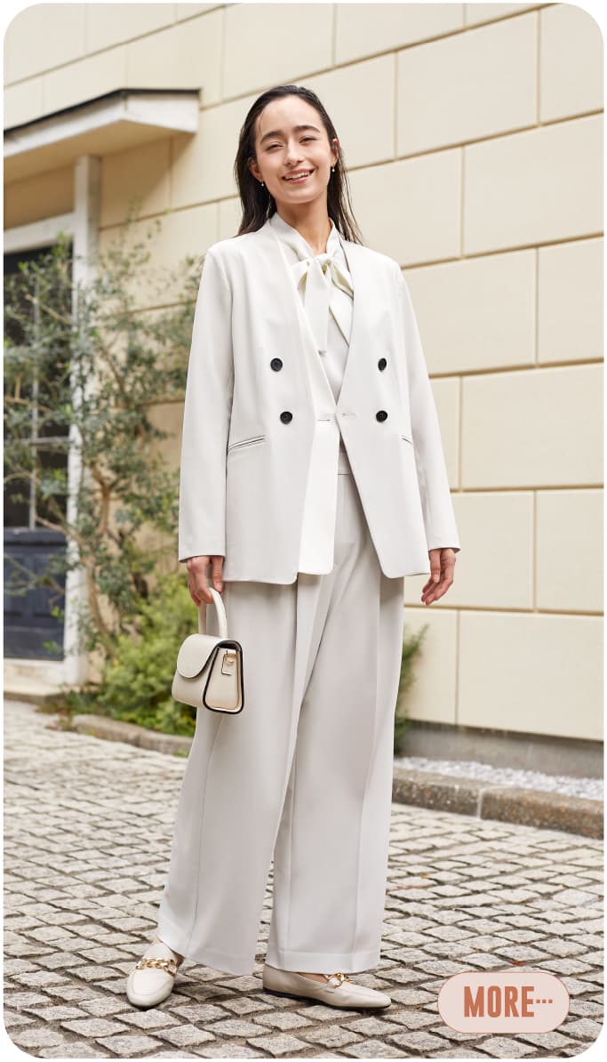 クラシックで上品なホワイトのセットアップは、清涼感のある麻混オックス素材を使用。インナーにストライプ柄を取り入れることで、マニッシュなオケージョンスタイルに。