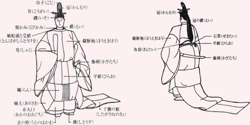 宮廷を警護する儀仗姿の武官。俗に左大臣・右大臣ともいう。向って右に老人、左に若人を飾る。