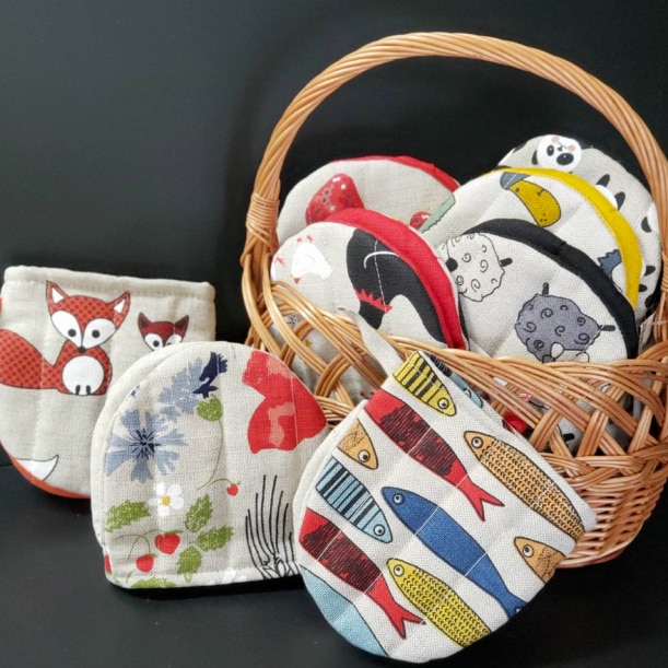 各1,650円コットンリネンの鍋つかみ。カラフルなデザインはキッチンを明るく彩ります。