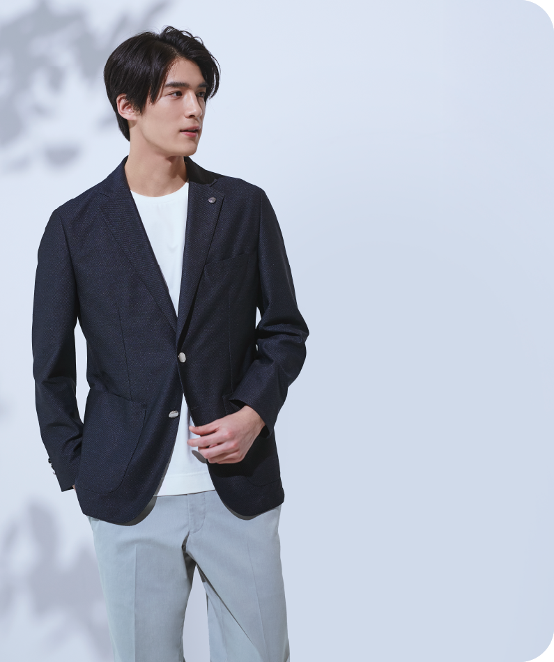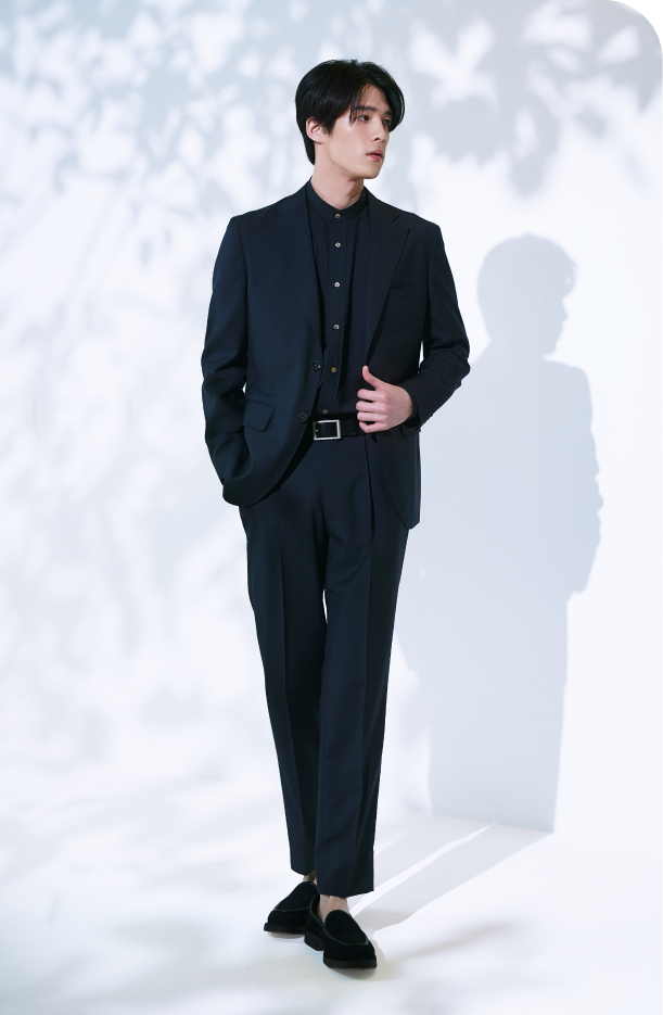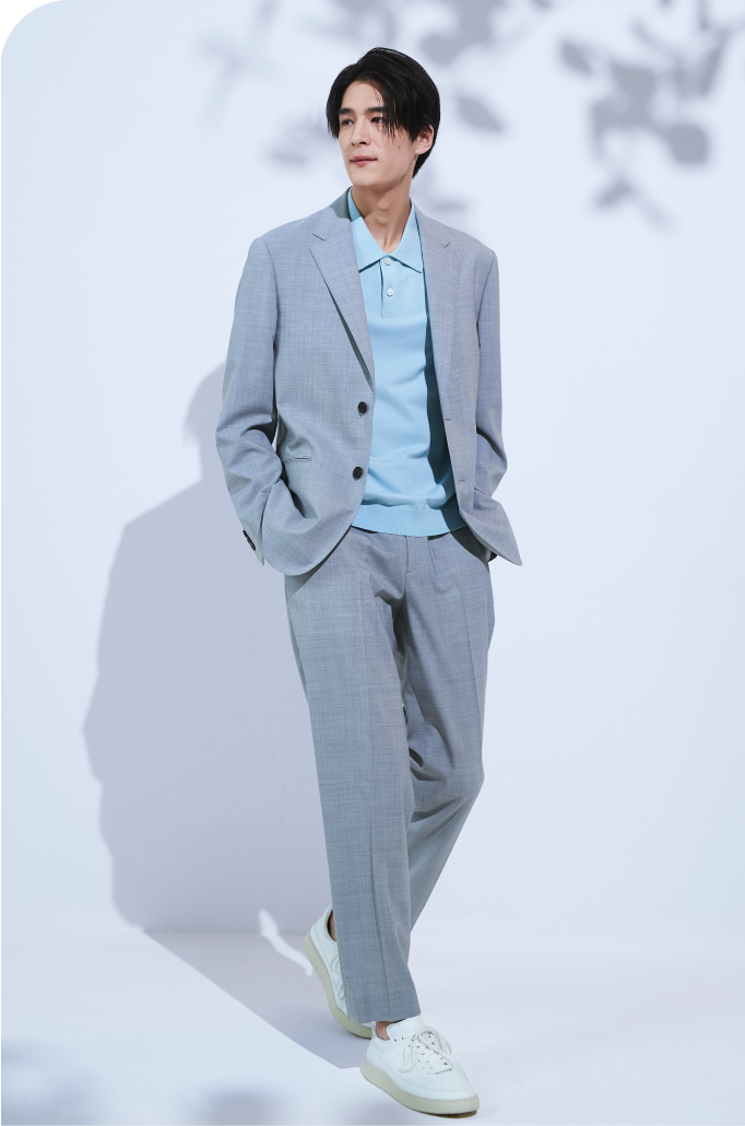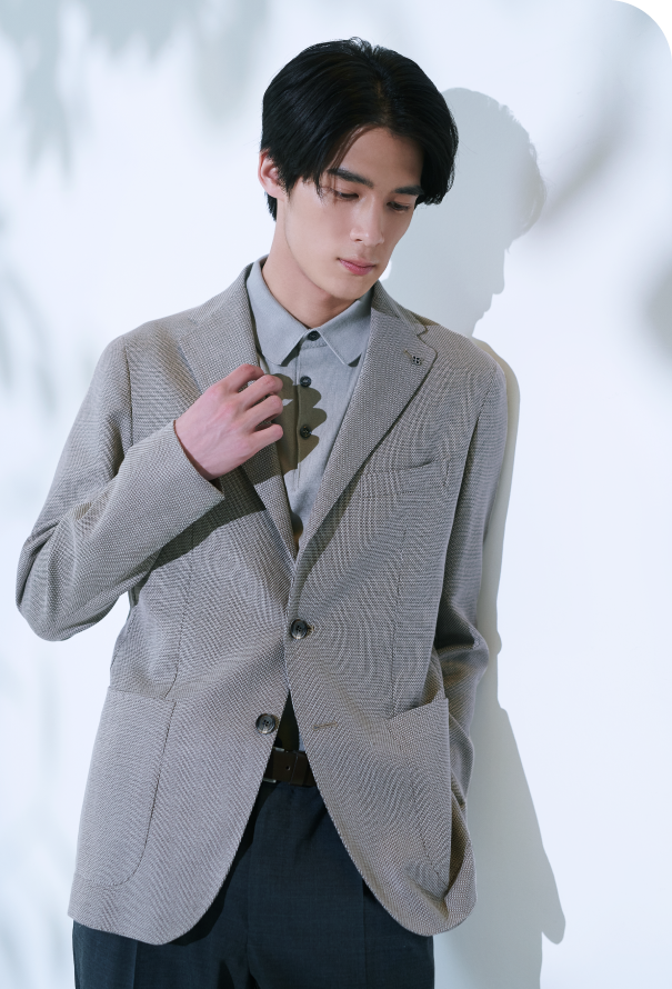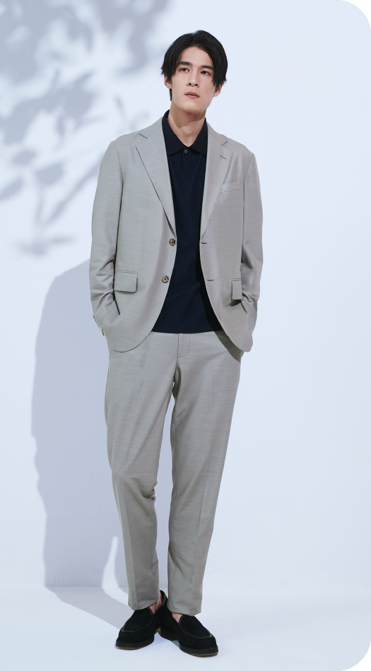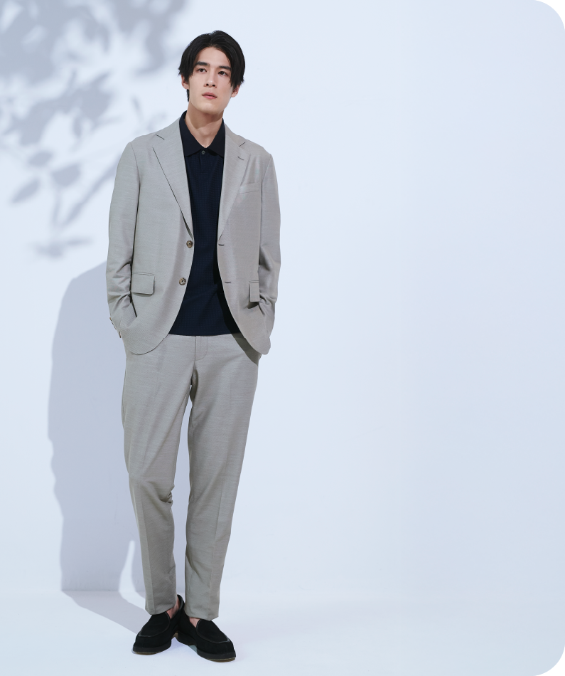 上質で滑らかな触り心地でありながら、シワになりにくく通気性に優れているセットアップ。出張にも最適な一着で夏まで長く着用できます。インナーは春らしいカラーのニットでアクセントに。