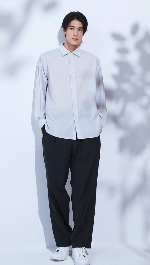 極細番手のウール糸を使用した長袖シャツとパンツはロングシーズン着用できる優れもの。ウールの毛羽を極限まで削ぎ落し、ドレープ感と上品な光沢感を兼ね備えたアイテムです。