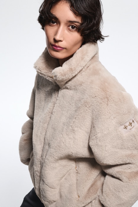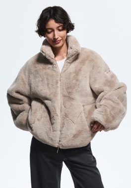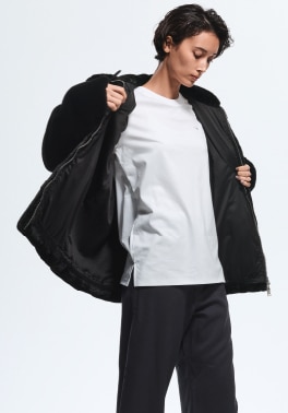 襟元で変化をつけることで異なる表情を楽しめるエコファーブルゾン。淡く優しい印象のニュートラルなカラーが冬の街に溶け込むよう。