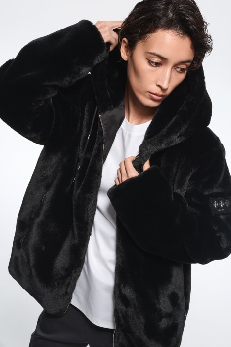 スタイリッシュなフード付きエコファージャケット。着心地のよいレギュラーフィットなサイズ感は、たっぷり目に着こなすのもおすすめ。