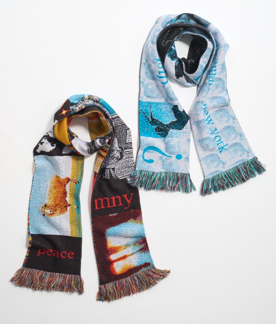 ボーダーレスやジェンダーレスをコンセプトとするブランドから、冬のコーディネートを格上げする大胆なジャカードニットのスカーフを柄違いで。