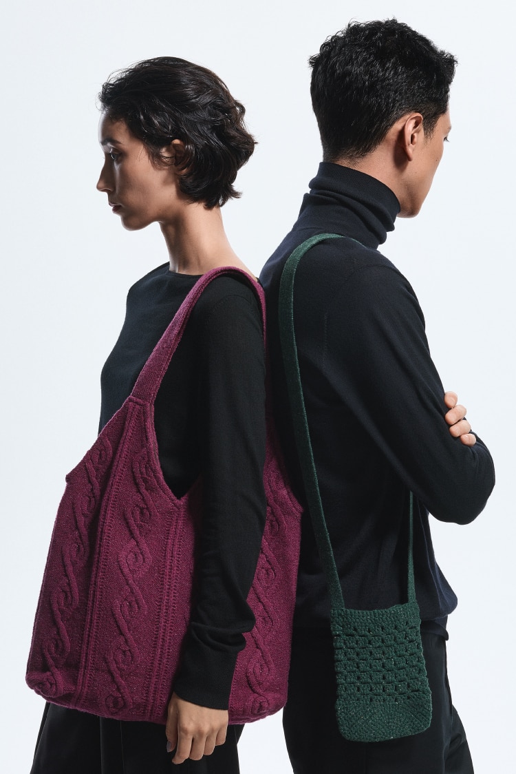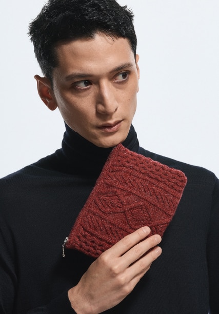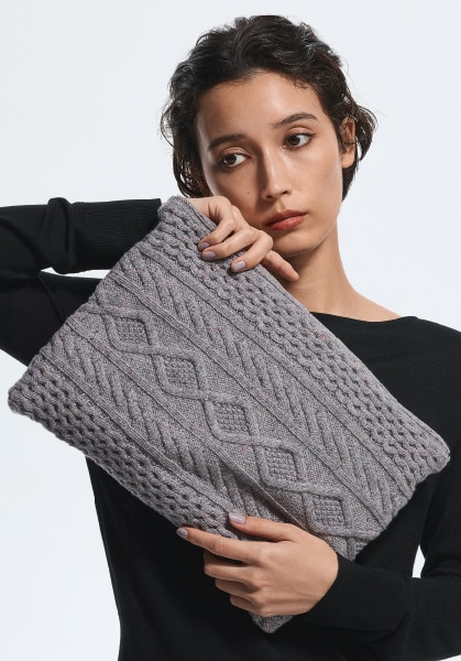 アラン模様をリデザインした編み柄を全面に配したポーチ。A4サイズの収納もOK、書類やステーショナリーなどマルチに使える汎用性の高さもポイント。