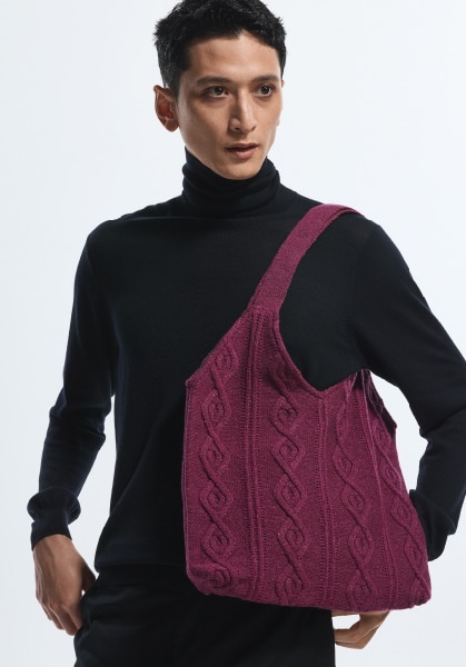 ダイヤの編み柄を全面に施した、カジュアルなニットショルダー。A4書類が入るサイズ感で裏地も付いて丈夫。性別・世代を問わずお使いいただけます。