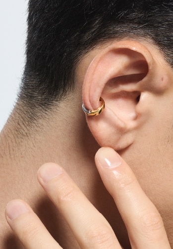 イエローゴールドとホワイトゴールドをリバーシブルで楽しめるフープイヤリング。いつも身に着けていたいベーシックデザインも魅力。