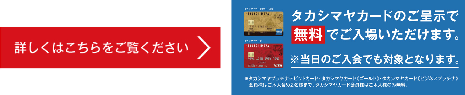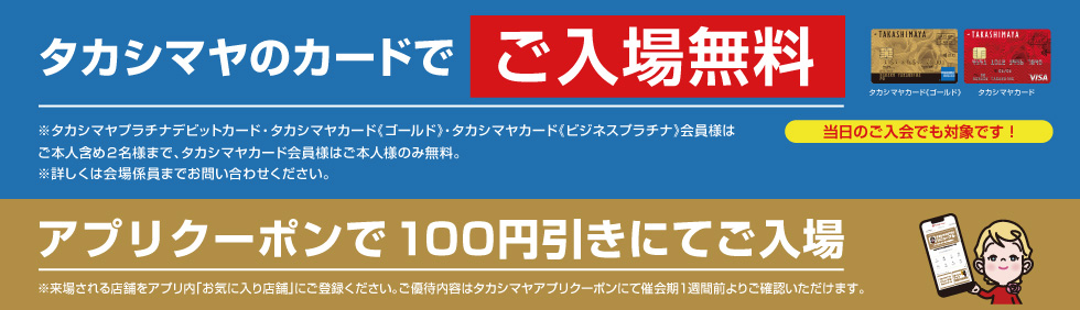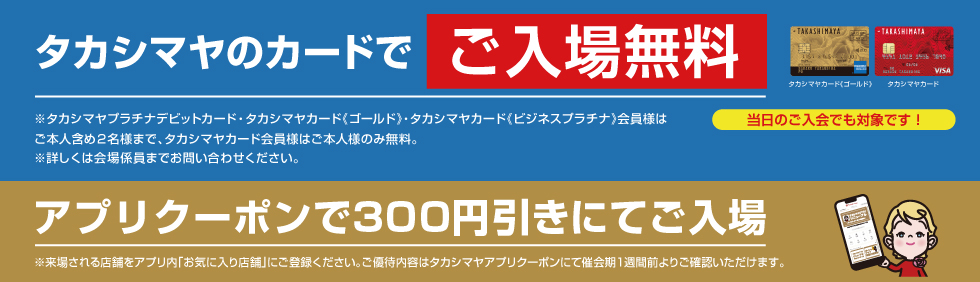 タカシマヤプラチナデビットカード、タカシマヤカード《ゴールド》、タカシマヤ株主様ご優待カード、タカシマヤ友の会会員証、ご招待券をお持ちのお客様は入場無料とさせていただきます。直接展覧会場入口へお越しください。