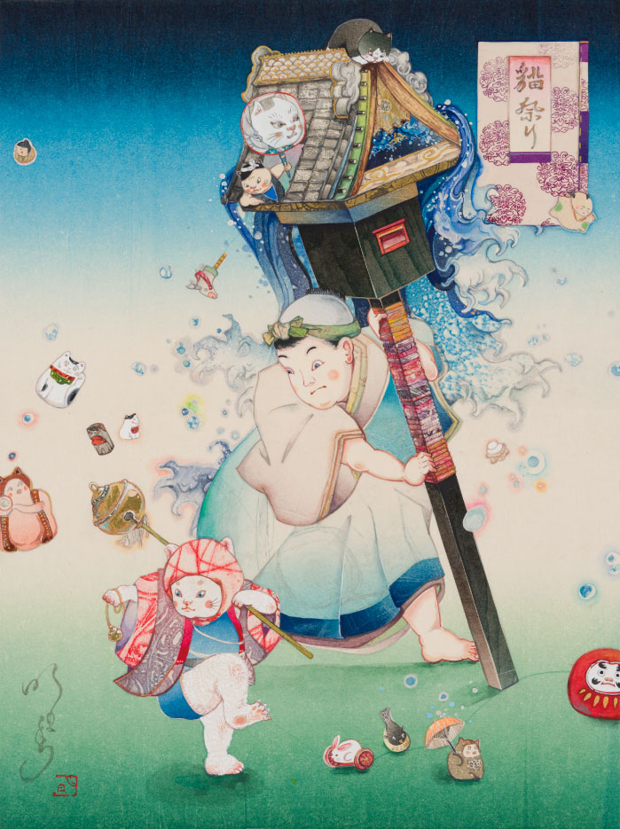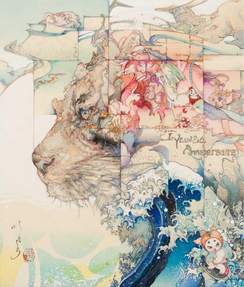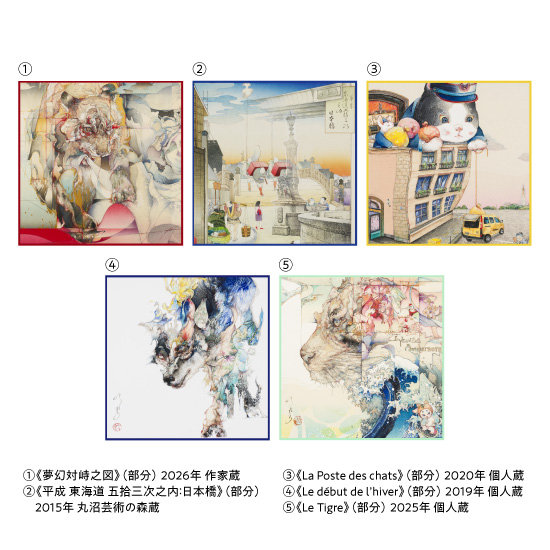 節句や暦、陰陽五行、歌舞伎など日本の伝統文化に着想を得た作品を通じて、“和”の精神と現代美の融合を探ります。2023年制作の《黒雲妖炎龍図》(龍を主題)と、新作《夢幻対峙之図》(虎を主題)を六曲一双の屏風として初公開し、その壮麗な入江の世界観を披露します。また、「東海道五十三次」シリーズをはじめとする、過去の名作へのオマージュ作品も展示。伝統と革新が交錯する入江作品の魅力を、存分にご堪能いただけます。