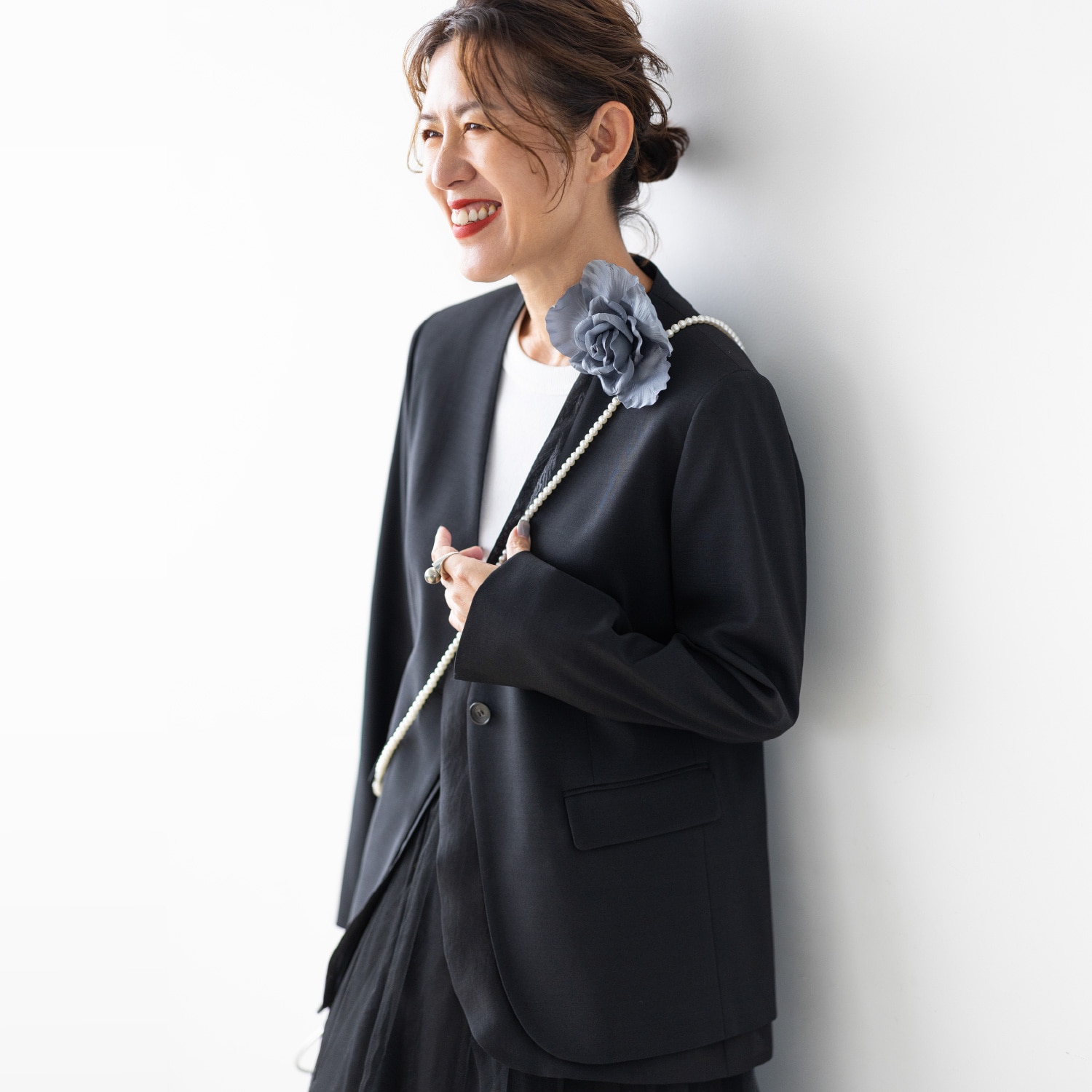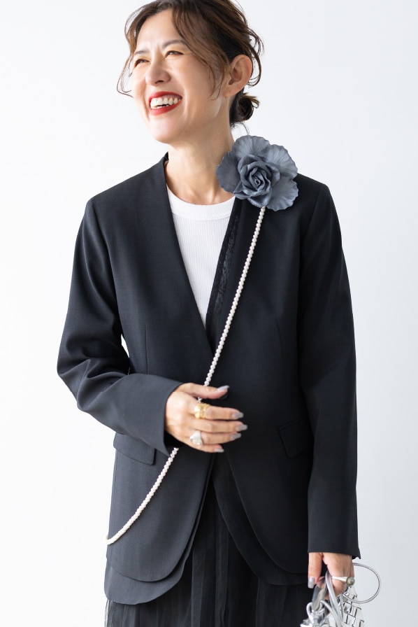 オリジナルで作ったコサージュ。パールのネックレスは長さがポイント。
