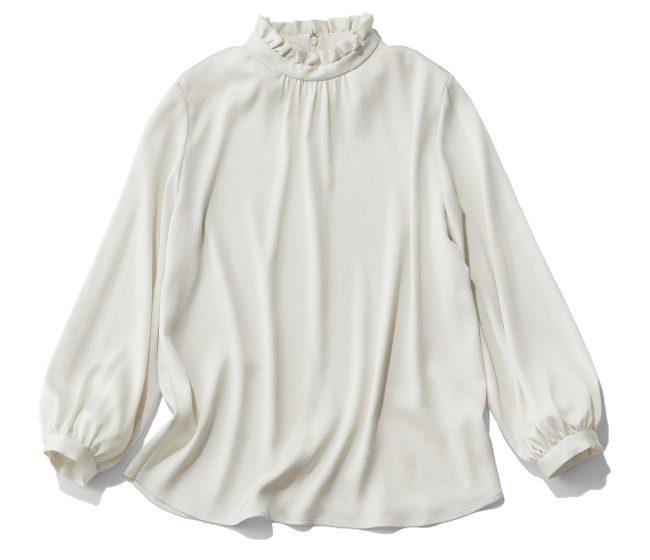 首元や袖口の繊細なギャザーが、着ると流れるような動きを作るのも素敵。
