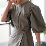 ボリューミーな袖で一気に今年顔になるブラウスは、二の腕をカバーしつつ立体感を強調することで上半身全体を華奢見えさせます。スカートのアシンメトリーなデザインが左右で異なる表情を操り、腰回りをすっきり整えます。