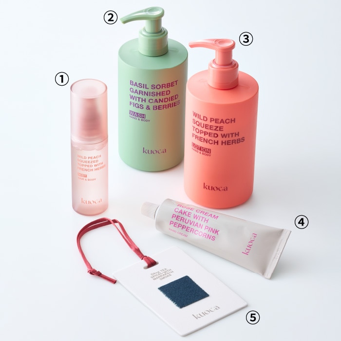 テーブルクロスからインスピレーションを受けたペーパータイプのフレグランスタグや全身に使えるフレグランスミストなど、さまざまな形で日々の暮らしに香りを届けるシリーズ。ワイルドピーチやバジルソルベといった、食をイメージさせるフルーティーな香りが揃っています。