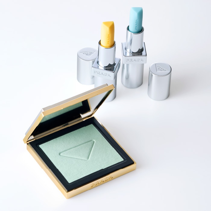 目を喜ばせる彩り豊かなパウダーとリップバームは、肌に乗せると馴染みカラーに。プラダ グリーンのフェイスパウダーは透明のヴェールのように肌を包み込みます。ゴールドラメとピンクラメが繊細な光を放つイエローのバームと、ピンクに発色して角層を保湿するブルーのバームは、チークとしても。