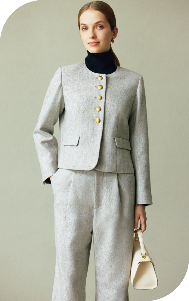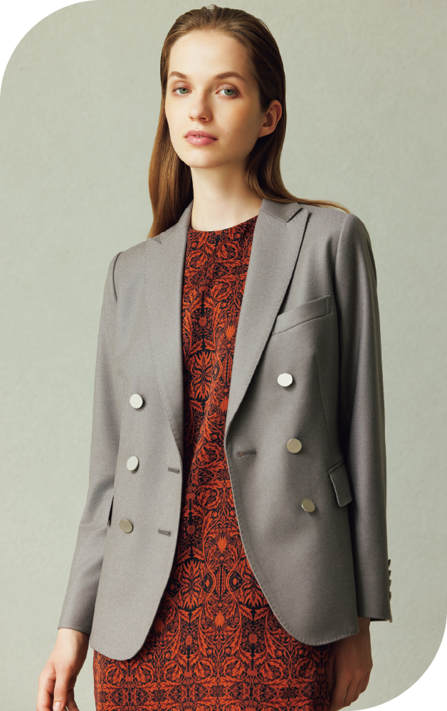 女性を美しく見せる美フォルムとハンドステッチ、上品な素材の艶感で一目で上質とわかるダブルジャケット。染色や織りなど尾州ですべての工程を施したこだわりの生地を使用した1着で着心地もしなやか。ニュアンスのあるグレージュが上品な印象を導く。