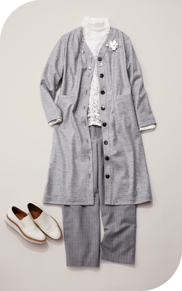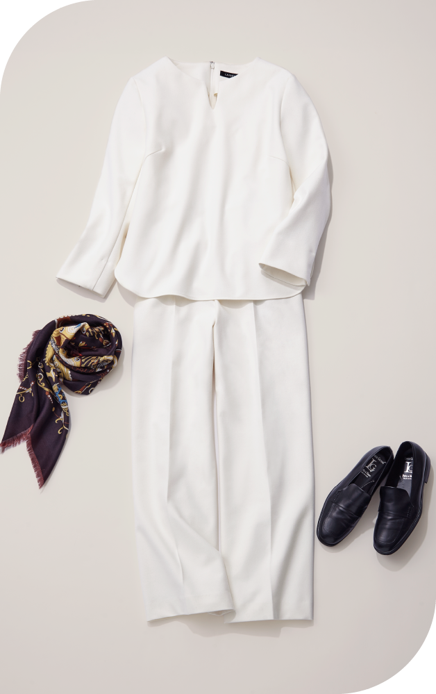 女性が最も美しく輝けることをコンセプトに掲げる、[ロートレアモン]の「ウィーヴウォームス」シリーズ。尾州産オリジナル織りの2WAYストレッチ生地で、柔らかな温もりを纏うような着心地をご提案。表裏起毛加工で肌触りも抜群で、冬映えするホワイトのワントーンスタイルも新鮮です。洗濯機で洗えるイージーケアも嬉しいポイント。