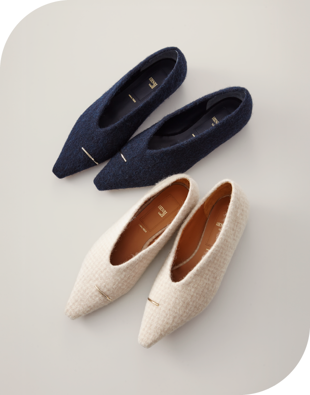 ブランドのアイコンであるモデルEileenを尾州産生地で仕立てたオリジナルデザイン。有機的なフォルムと心地よいフィット感が人気の1足を、上品な温かみを演出する冬にぴったりの起毛仕立ての生地で。