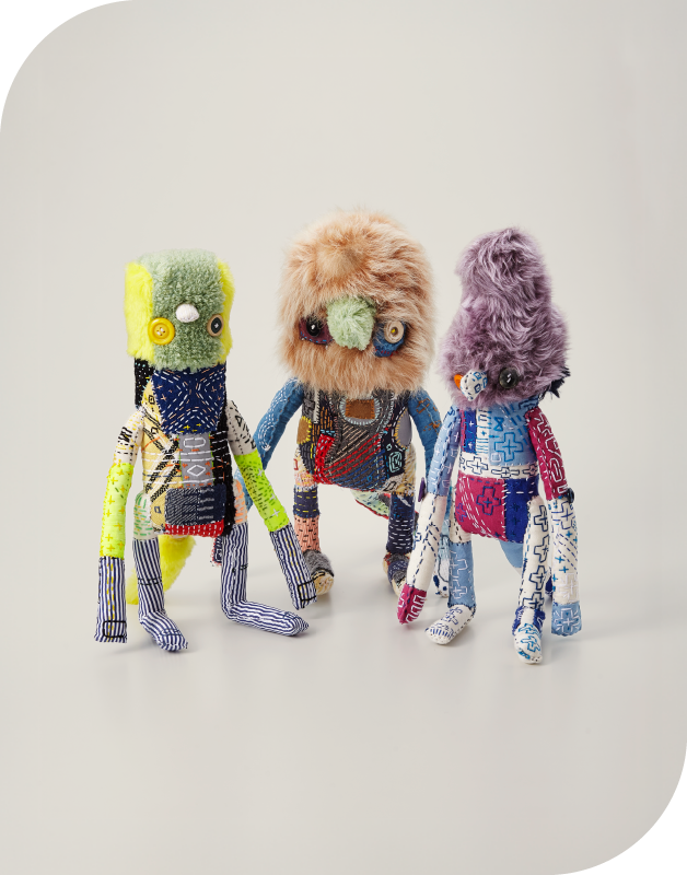 ぬいぐるみ作家・榎本晋氏の手がける[NOBIGURUMI]。作家本人も愛知県で生まれ育ち、約8年前から尾州の生地を中心に制作しています。「少し毒のあるかわいさ」を秘めたぬいぐるみたちは、すべて1点物。綿をパンパンに詰めるために刺し子で補強しつつ、それぞれが持つオーラや性格を糸の模様で表現しています。