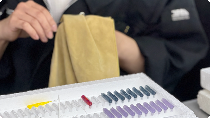 OLEAのメンバーは、実際に福井県鯖江市の眼鏡工房を訪問し、製造工程を見学。素材選びから組み立てまで、職人の手仕事に直接触れることで、細部にまで込められた思いを体感。特に、磨きの作業や音の響きにこだわる工程では「普段使いにも安心感をもたらすものづくりとは何か」を深く学びました。こうして得た職人の誠実な考え方や技術への理解が、製品開発の大きな指針に。「effe forte」には、その経験で吸収した素材選定や形状デザインへのこだわり、作り手の「人を守りたい」という想いが反映されています。