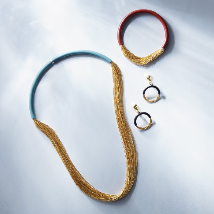 明治30年創業、京都で金糸銀糸の製造に携わる「寺島保太良商店」の煌びやかに輝く金糸に漆塗りを合わせたモダンアクセサリー。