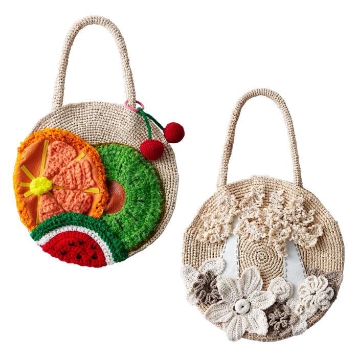 フィリピンの自社工房でラフィアの編み技術を指導する<スルシィ>のバッグに文化服装学院の学生が装飾。ニットやレザーの残革を用い、学生ならではの感性でデザイン。