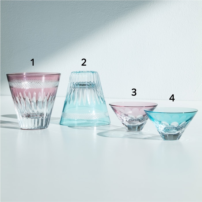 端材の活用という挑戦から生まれた「透翠」は、中金硝子総合の矜持が詰まった特別な色。江戸切子のルーツであるソーダガラスが用いられ、熟練職人の高度な技術によって輝きを放つ。真上からのぞけば大輪の花火があがり、逆さにすれば富士の姿が現れ、江戸切子の奥深い技法とモダンな感性が楽しめる。