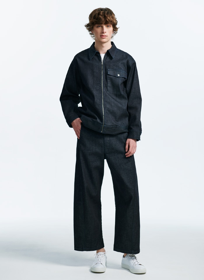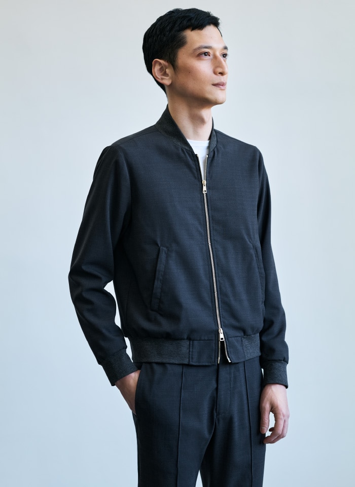 ビジネスシーンで活躍するコンフォタブルなパンツで名を馳せるイタリア・フィレンツェ発の「ジャブスアルキヴィオ」。こちらは、ベストセラーのMA-1とウエストがドローコードになったパンツを、デザインはそのままに、素材には、廃棄生地・衣料などを再生させたリサイクルポリエステル「RENU®」を20%使用した高島屋別注。上下開きのジップアップブルゾンは、オンでもオフでも活躍。ウォッシャブルなので気軽にお手入れできるのもいい。