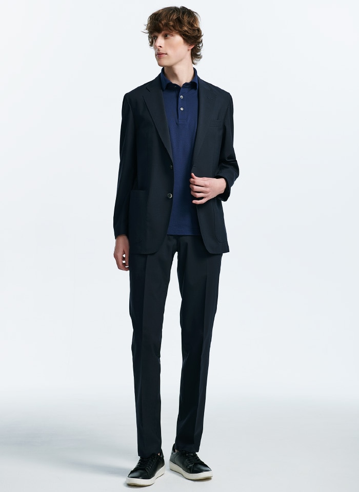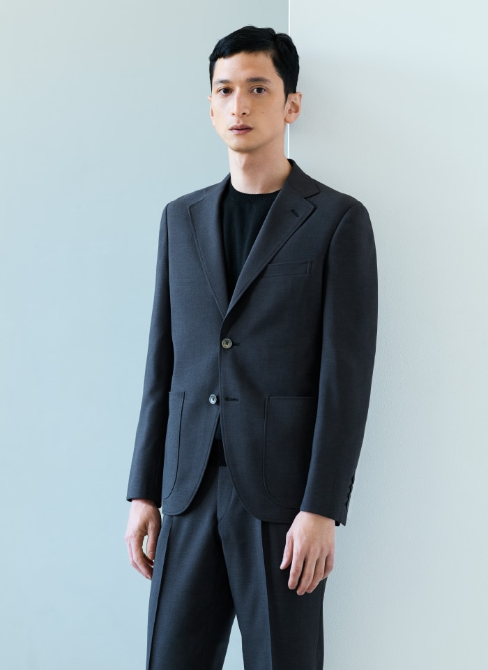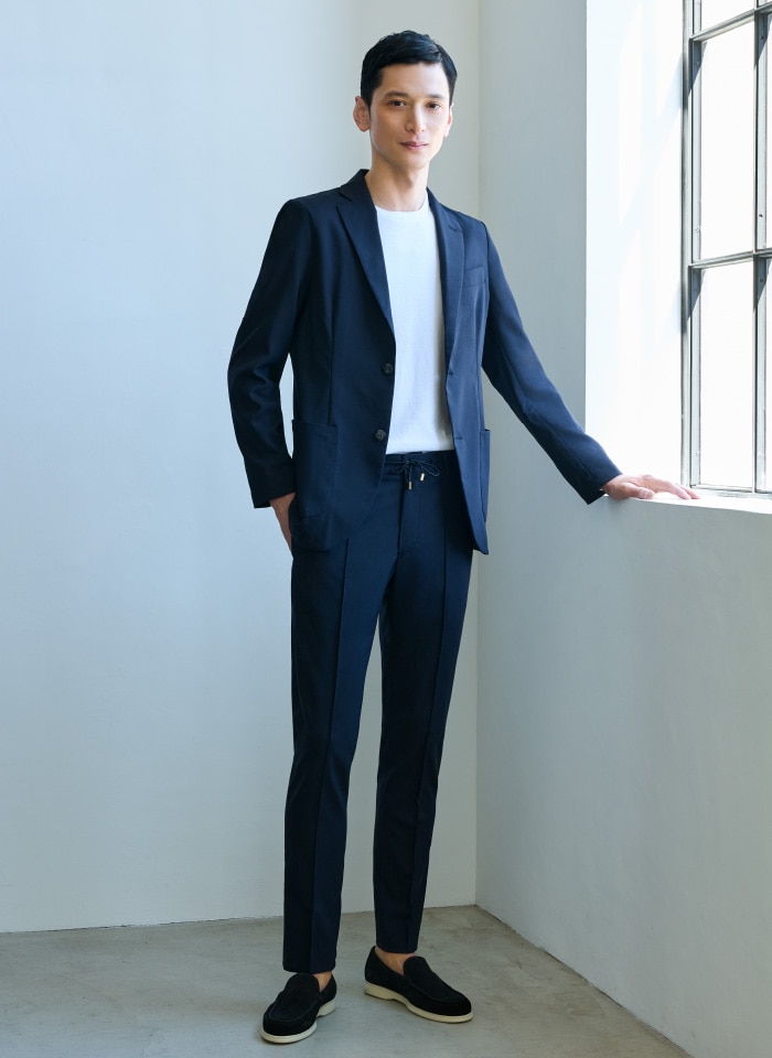 リサイクルポリエステルを20%使用した高島屋別注の「RENU®」素材を使用したセットアップ。ジャケットはラペルを大きく、着丈を短く、Vゾーンを高めに。日本人の体型に合わせた洗練のシルエット。パンツはドローコードのゴールド金具がアクセント。