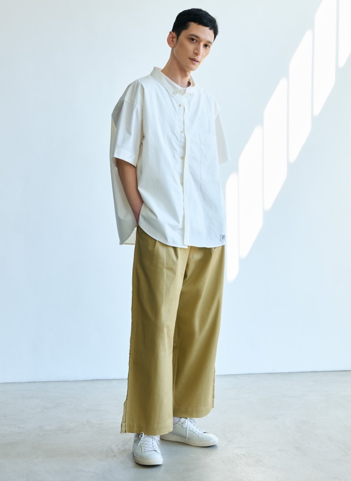 余剰生地や廃棄予定の衣料品などをアップサイクルして新しいデザインに仕立て直したユニークなアイテム。トップスはボタンダウンシャツとTシャツをドッキングしたようなユニークデザインが特長で、ホワイトは高島屋限定カラー。パンツは裾口にジャケットのディテールをあしらった遊び心ある一本。